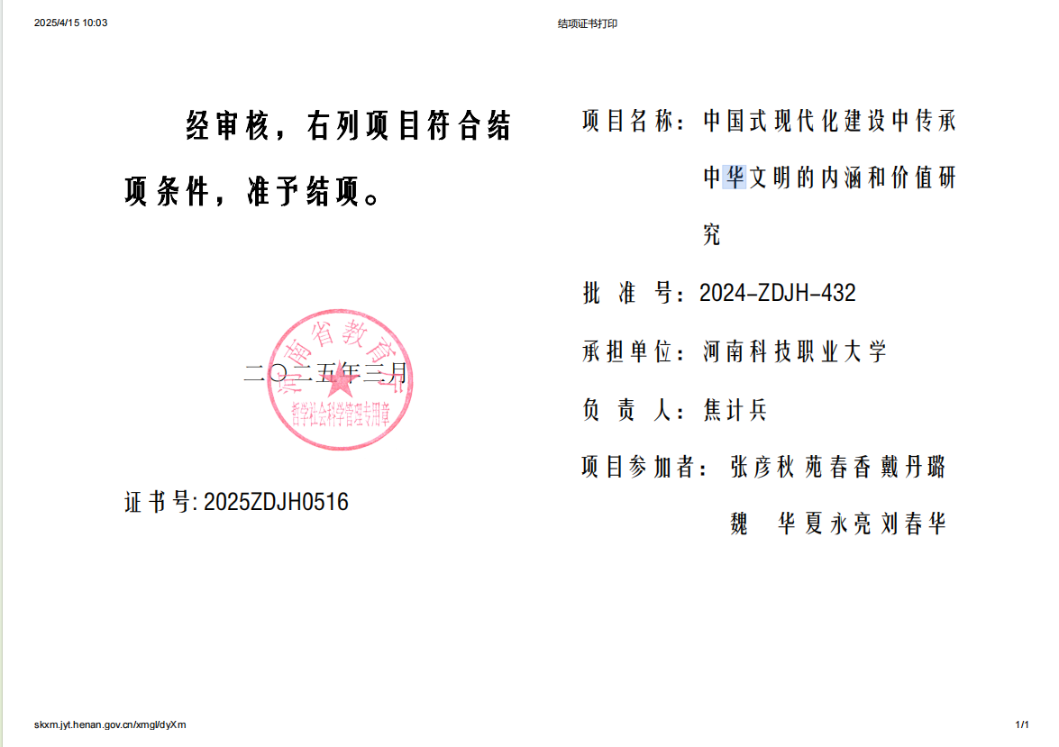 2025年4月15日,OK138太阳集团传来喜讯,由学院教师焦计兵老师主持,张彦秋、苑春香、戴丹璐等多位老师参与的河南省高校人文社会科学研究一般项目“中国式现代化建设中传承中华文明的内涵和价值研究”(批准号:2024-ZDJH-432),经河南省教育厅审核,顺利通过审核,符合结项条件,准予结项。