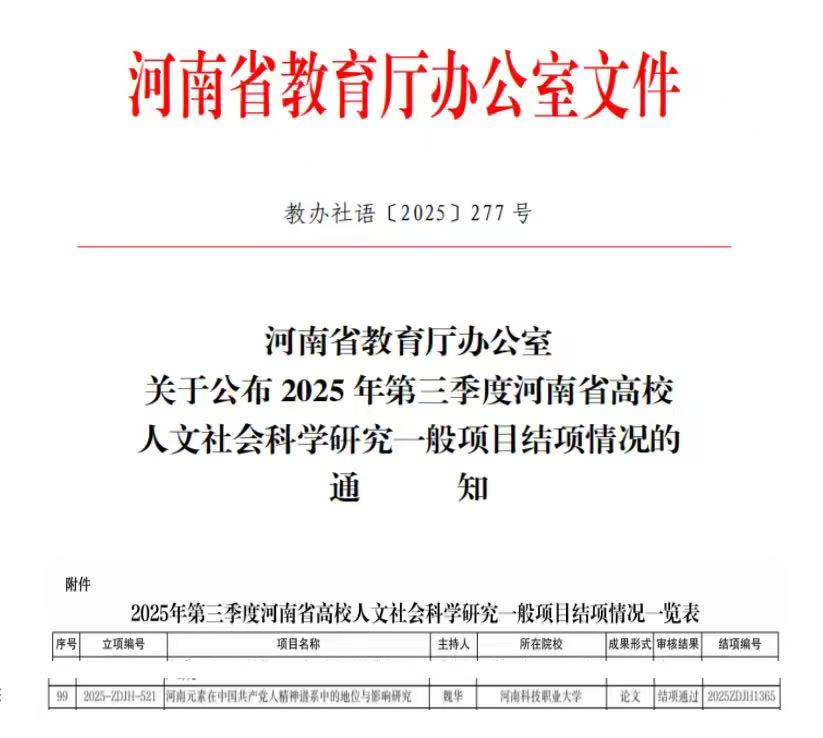 近日,河南省教育厅办公室印发《关于公布2025年第三季度河南省高校人文社会科学研究一般项目结项情况的通知》(教办社语〔2025〕277号),我院魏华老师主持的“河南元素在中国共产党人精神谱系中的地位与影响研究”(立项编号:2025-ZDJH-521)项目,经审核以“论文”形式通过结项,结项编号为2025ZDJH1365。