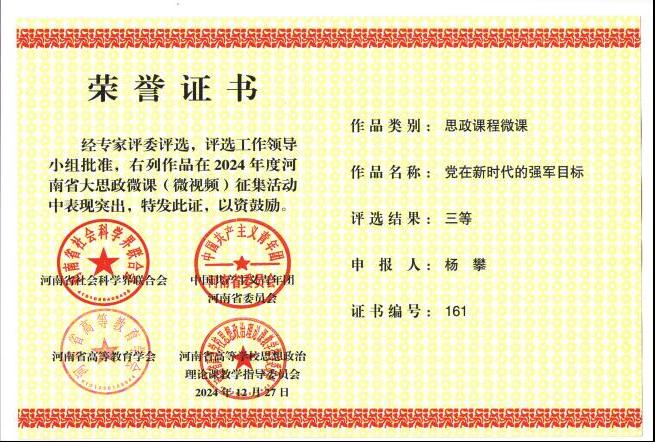 近日,由河南省社科联、共青团河南省委、河南省高等教育学会、河南省高校思想政治理论课教学指导委员会联合主办的2024年度河南省大思政课(微视频)征集活动结果揭晓。河南科技职业大学OK138太阳集团教师团队与学生创作团队脱颖而出,凭借《党在新时代的强军目标》《做新时代忠诚的爱国者》两部作品分获思政课程微课三等奖与大学生主题微视频三等奖,展现了我校OK138太阳集团在思政教育创新与实践育人方面的显著成效。