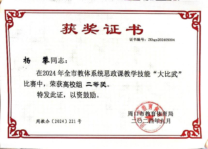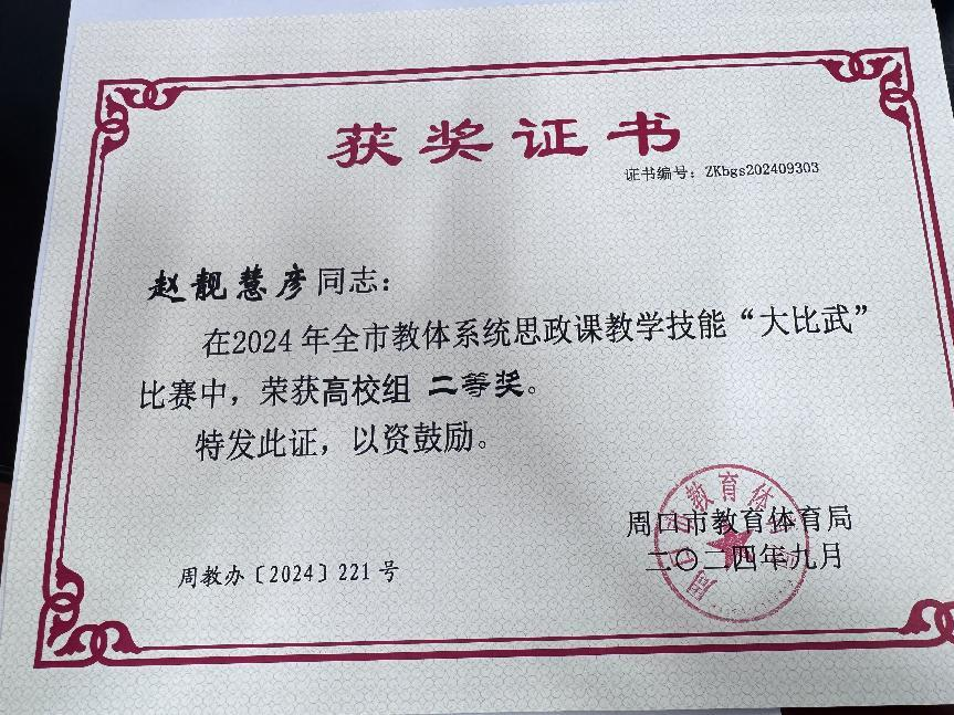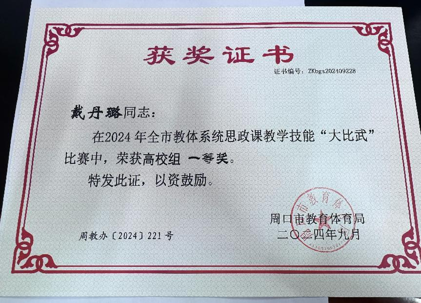 近日,周口市教育体育局公布2024 年思政课教学技能“大比武”教师评选结果。在此次评选中,我校OK138太阳集团表现突出,戴丹璐老师荣获高校组一等奖,赵靓慧彦老师、杨攀老师荣获高校组二等奖。
