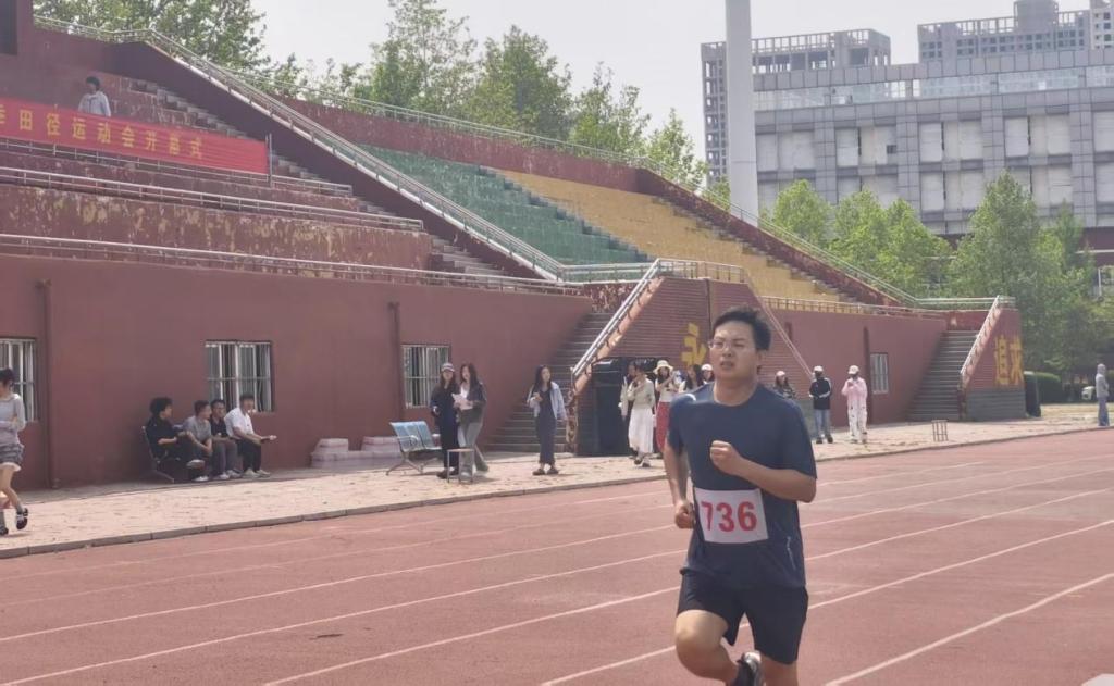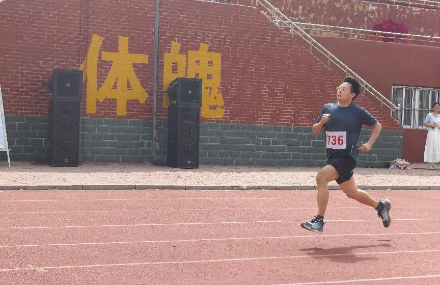 男子1500米跑考验着选手们的耐力。赛程漫长,参赛老师焦计兵始终坚持不懈,即使体力不支也依旧咬牙前行,任凭汗水浸透衣衫,最终以绝对优势冲过终点,将男子组冠军收入囊中。