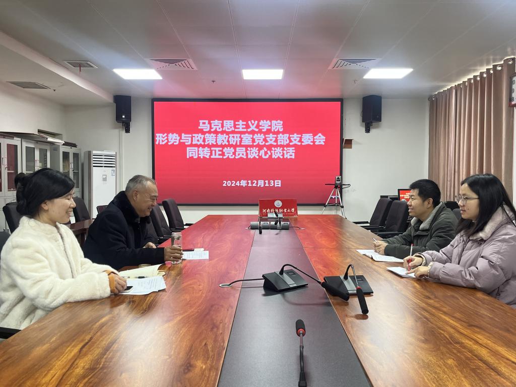 为进一步加强对年轻党员的培养教育,激励新转正党员坚定理想信念、提高思想觉悟、增强党性观念,2024年12月13日上午,在综合楼12楼会议室,形势与政策教研室党支部书记徐金安、组织委员许凤和宣传委员张宇与新转正党员杨攀、李杏杏进行了谈心谈话。